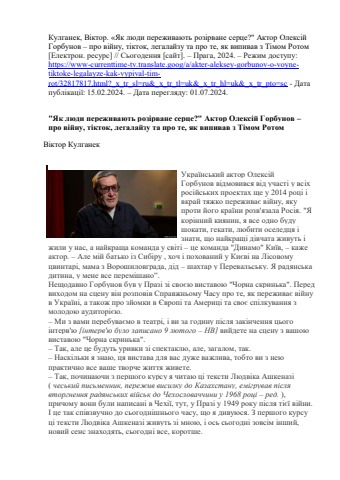 Кулганек, Віктор. «Як люди переживають розірване серце?" Актор Олексій Горбунов – про війну, тікток, легалайзу та про те, як випивав з Тімом Ротом [Електрон. ресурс] // Сьогодення [сайт]. – Прага, 2024. – Режим доступу: https://www-currenttime-tv.translate.goog/a/akter-aleksey-gorbunov-o-voyne-tiktoke-legalayze-kak-vypival-tim-rot/32817817.html?_x_tr_sl=ru&_x_tr_tl=uk&_x_tr_hl=uk&_x_tr_pto=sc - Дата публікації: 15.02.2024. – Дата перегляду: 01.07.2024.