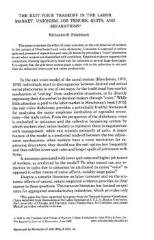 THE EXIT-VOICE TRADEOFF IN THE LABOR MARKET: UNIONISM, JOB TENURE, QUITS, AND SEPARATIONS* RICHARD B. FREEMAN This paper examines the effect of trade unionism on the ...