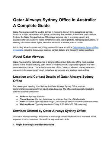 The Qatar Airways Sydney Office is strategically located to cater to passengers traveling to and from Australia. The office provides a seamless experience for both business and leisure travelers by offering services related to ticketing, flight changes, and other customer inquiries.