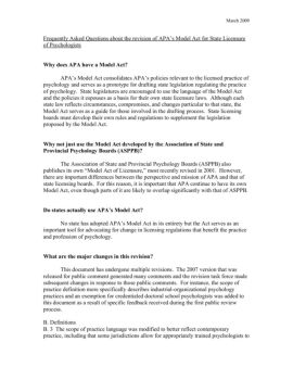March 2009 Frequently Asked Questions about the revision of APA’s Model Act for State Licensure of Psychologists Why does APA have a Model Act?