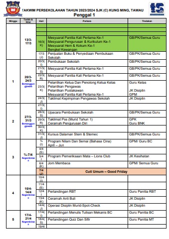 Takwim SJK (C) Kung Ming, Tawau