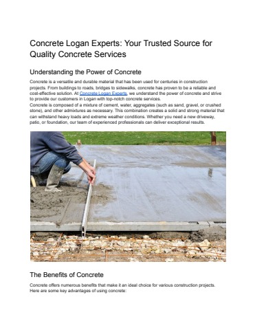 Concrete is a versatile and durable material that has been used for centuries in construction projects. From buildings to roads, bridges to sidewalks, concrete has proven to be a reliable and cost-effective solution. At Concrete Logan Experts, we understand the power of concrete and strive to provide our customers in Logan with top-notch concrete services
