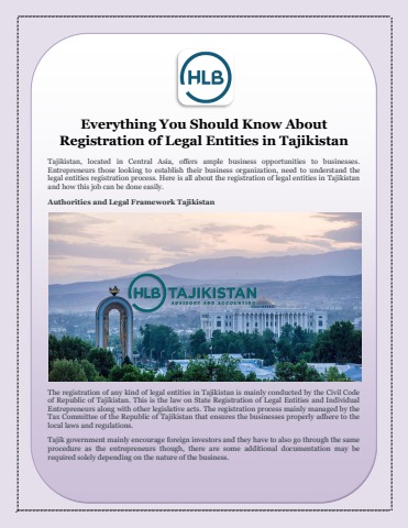 The registration of any kind of legal entities in Tajikistan is mainly conducted by the Civil Code of Republic of Tajikistan. This is the law on State Registration of Legal Entities and Individual Entrepreneurs along with other legislative acts. The registration process mainly managed by the Tax Committee of the Republic of Tajikistan that ensures the businesses properly adhere to the local laws and regulations.
