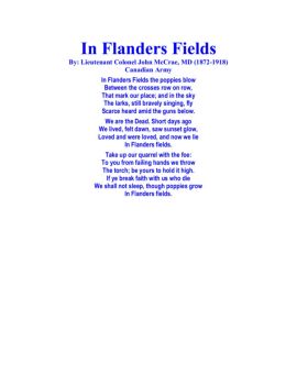 In Flanders Fields By: Lieutenant Colonel John McCrae, MD (1872-1918) Canadian Army In Flanders Fields the poppies blow Between the crosses row on row,