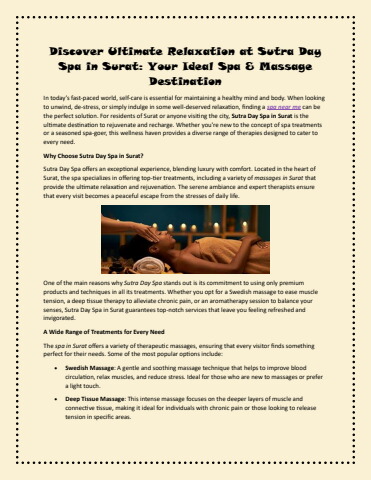 If you’ve been searching for a spa near me or looking for massage in Surat, Sutra Day Spa is the place to be. With its exceptional services, calming ambiance, and expert therapists, it offers an unparalleled experience that will leave you feeling refreshed, rejuvenated, and ready to face whatever life brings your way. Don’t wait—book your appointment today and embark on your journey to relaxation at Sutra Day Spa in Surat!