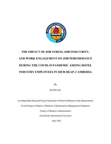 This study examined the impact of Job Stress, Job Insecurity, and Work Engagement on Job Performance during the COVID-19 pandemic among hotel Industry employees in Siem Reap, Cambodia. This study aimed to find out if hotel employees were stressed and felt insecure during COVID-19 pandemic because the low number of tourists threatened their jobs. This study also helps employers to understand employees' behavior during unexpected situations.