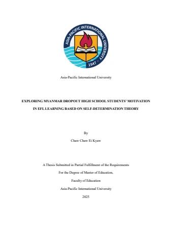 In Myanmar, English language learning primarily takes place in EFL learning centers rather than government schools due to the limited proficiency of many students. Since 2021, socio-political factors have significantly disrupted the education system, leading many Myanmar students to drop out of high school and seek alternative educational opportunities. While school dropouts are generally perceived as a negative outcome, enrolling in EFL learning centers reflects an aspect of motivation. This study examines the role of motivation within the Self-Determination Theory (SDT) framework among Myanmar high school dropout students who continue learning English. Specifically, it explores the underlying motivational factors and their impact on students&#39; engagement with EFL learning. The study involved nine Myanmar high school dropout students who have attended or are currently attending English language classes in various cities. Data were collected through online and face-to-face interviews, focusing on students’ experiences in learning English. Findings indicated that motivation in EFL learning is driven by inner spark, doors of opportunity, and loss of momentum in formal education, alongside the SDT elements of pursuing purposeful path, empowerment through growth, connections and expanding aspirational horizons. The results also suggest that students exhibit a high degree of autonomous motivation in their learning and develop stronger social engagement compared to their previous educational experiences. Additionally, while some students are motivated to pursue further education, others express a strong desire to contribute to their communities. Overall, the study highlights that Myanmar high school dropout students demonstrate motivation in learning English both to achieve personal goals and to support their society. These findings underscore the need for<br>iv<br>socio-cultural, metacognitive, and technology enhanced teaching approaches tailored to the autonomous learning styles of these students.