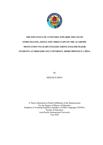 THE INFLUENCE OF ATTITUDES TOWARDS THE USE OF STORYTELLING, SONGS AND VIDEO CLIPS ON THE ACADEMIC MOTIVATION TO LEARN ENGLISH AMONG ENGLISH MAJOR STUDENTS AT SHIJIAZHUANG UNIVERSITY, HEBEI PROVINCE, CHINA