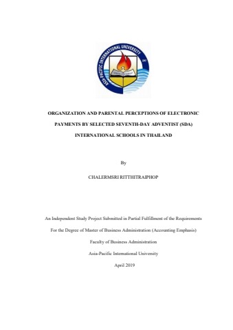 This research project explored the use of electronic payments by selected Seventh-day Adventist International Schools in Thailand, and investigated factors such as their benefits, trust, self-efficacy, ease of use, and security that affected parental perceptions of these payments.