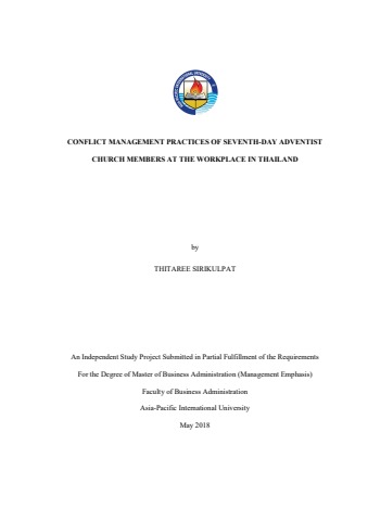 This study aims to investigate how the Seventh-day Adventist (SDA) Church members in Thailand manage conflict at the workplace with the influence of their fundamental belief, moral laws, and interpersonal practices. The research involved a descriptive exploration design based on a quantitative technique method. The 171 of SDA church members, who are organization’s workers, were selected as respondents. Factor analysis was used to extract features that explain the practices of SDA Church members in Thailand when they are managing conflict at their workplace.