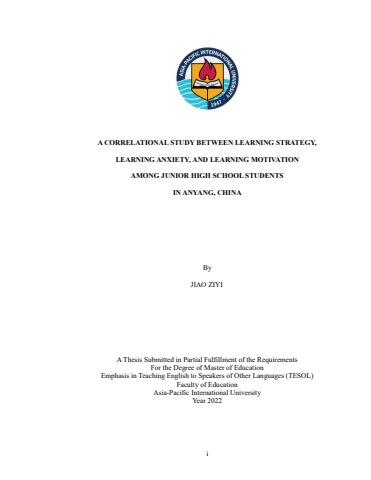 Many studies have examined strategies, anxieties, and motivation in learning English as a second language. A few have investigated these three variables together, and the results have been inconsistent. None have examined them among Chinese junior high school students attending a private boarding school. Thus, this study aimed to examine the extent to which learning strategies are related to learning anxieties and motivations among junior high school students attending a private boarding school in Anyang, China.