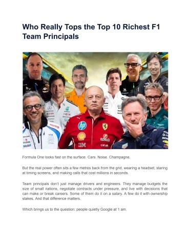 In the 2025 Formula 1 season, team principals are among the highest‑paid executives in motorsport, often earning multi‑million‑dollar annual salaries. Top figures like Christian Horner of Red Bull and Toto Wolff of Mercedes command salaries in the ballpark of $7–10 million per year, including bonuses tied to performance and championships, making them among the best‑paid management roles in the sport. Smaller teams’ principals typically earn less, with salaries above $1 million but well below the figures at championship contenders. These pay packages reflect the high responsibility and commercial success tied to leading an F1 team.