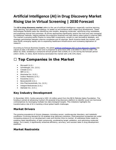 According to Fortune Business Insights, the global artificial intelligence (AI) in drug discovery market was valued at USD 3.00 billion in 2022 and is projected to grow from USD 3.54 billion in 2023 to USD 7.94 billion by 2030, exhibiting a compound annual growth rate (CAGR) of 12.2% during the forecast period (2023–2030). In 2022, North America dominated the market with a 69.33% share.