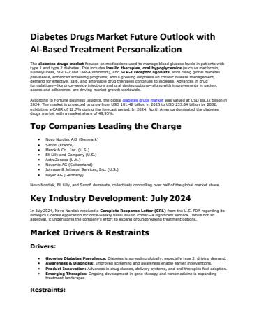 According to Fortune Business Insights, the global diabetes drugs market was valued at USD 88.32 billion in 2024. The market is projected to grow from USD 101.48 billion in 2025 to USD 233.84 billion by 2032, exhibiting a CAGR of 12.7% during the forecast period. In 2024, North America dominated the diabetes drugs market with a market share of 49.95%.