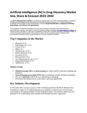 The integration of Artificial Intelligence (AI) into drug discovery processes is revolutionizing the pharmaceutical industry. According to Fortune Business Insights, the global AI in drug discovery market was valued at USD 3.00 billion in 2022 and is projected to reach USD 7.94 billion by 2030, exhibiting a CAGR of 12.2% during the forecast period. This growth is driven by the increasing need for efficient drug development processes and the rising prevalence of chronic diseases worldwide.