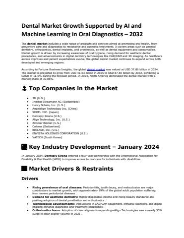 According to Fortune Business Insights, the global dental market was valued at USD 37.86 billion in 2024. The market is projected to grow from USD 41.03 billion in 2025 to USD 87.65 billion by 2032, exhibiting a CAGR of 11.5% during the forecast period. In 2024, North America dominated the dental market with a market share of 39.06%.
