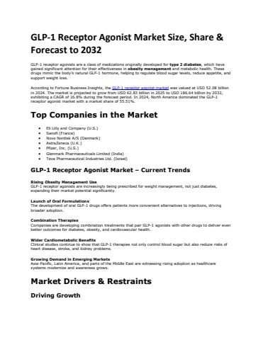 According to Fortune Business Insights, the global GLP-1 receptor agonist market was valued at USD 52.08 billion in 2024. The market is projected to grow from USD 62.83 billion in 2025 to USD 186.64 billion by 2032, exhibiting a CAGR of 16.8% during the forecast period. In 2024, North America dominated the GLP-1 receptor agonist market with a market share of 55.51%.