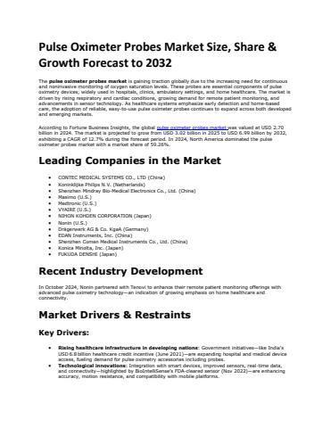 According to Fortune Business Insights, the global pulse oximeter probes market was valued at USD 2.70 billion in 2024. The market is projected to grow from USD 3.02 billion in 2025 to USD 6.99 billion by 2032, exhibiting a CAGR of 12.7% during the forecast period. In 2024, North America dominated the pulse oximeter probes market with a market share of 59.26%.