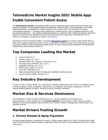 According to Fortune Business Insights, the global telemedicine market was valued at USD 104.64 billion in 2024. The market is projected to grow to USD 111.99 billion in 2025 and reach USD 334.80 billion by 2032, recording a CAGR of 16.9% during the forecast period. In 2024, North America dominated the telemedicine market with a market share of 48.01%.