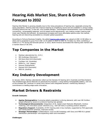 According to Fortune Business Insights, the global hearing aids market was valued at USD 12.96 billion in 2023 and is projected to grow from USD 14.35 billion in 2024 to USD 34.76 billion by 2032, exhibiting a CAGR of 11.7% during the forecast period. In 2023, North America dominated the hearing aids market with a market share of 38.19%.