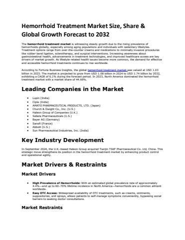 According to Fortune Business Insights, the global hemorrhoid treatment market was valued at USD 1.03 billion in 2023. The market is projected to grow from USD 1.08 billion in 2024 to USD 1.74 billion by 2032, exhibiting a CAGR of 6.1% during the forecast period. In 2023, North America dominated the hemorrhoid treatment market with a market share of 44.66%.