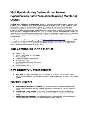 According to Fortune Business Insights, the global vital sign monitoring devices market was valued at USD 5.87 billion in 2024 and is projected to grow from USD 6.27 billion in 2025 to USD 10.47 billion by 2032, exhibiting a compound annual growth rate (CAGR) of 7.6% during the forecast period. In 2024, North America dominated the market with a 42.47% share.