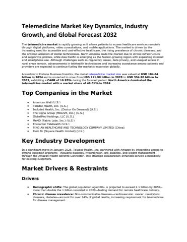 According to Fortune Business Insights, the global telemedicine market size was valued at USD 104.64 billion in 2024 and is projected to grow from USD 111.99 billion in 2025 to USD 334.80 billion by 2032, exhibiting a CAGR of 16.93% during the forecast period. North America dominated the telemedicine market with a market share of 48.01% in 2024.