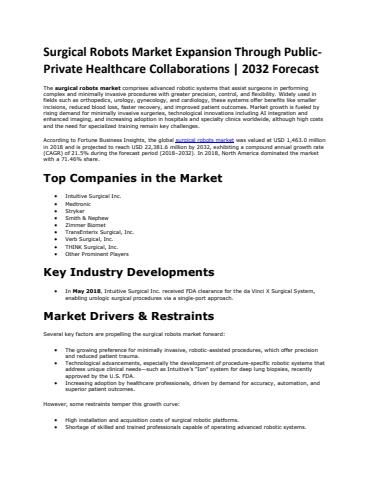According to Fortune Business Insights, the global surgical robots market was valued at USD 1,463.0 million in 2018 and is projected to reach USD 22,381.6 million by 2032, exhibiting a compound annual growth rate (CAGR) of 21.5% during the forecast period (2018–2032). In 2018, North America dominated the market with a 71.46% share.