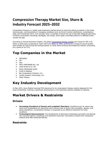 According to Fortune Business Insights, the global compression therapy market was valued at USD 3.02 billion in 2018 and is projected to reach USD 6.62 billion by 2032, growing at a compound annual growth rate (CAGR) of 5.9% during the forecast period. In 2018, North America dominated the market, accounting for a share of 34.77%.