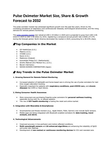 The global pulse oximeter market was valued at USD 2.34 billion in 2024 and is projected to grow from USD 2.46 billion in 2025 to USD 3.56 billion by 2032, registering a compound annual growth rate (CAGR) of 5.4% during the forecast period. North America dominated the market in 2024, accounting for a 40.63% share.