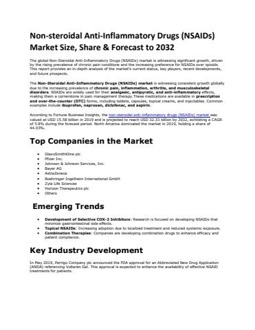 According to Fortune Business Insights, the global non-steroidal anti-inflammatory drugs (NSAIDs) market was valued at USD 15.58 billion in 2019 and is projected to reach USD 32.33 billion by 2032, exhibiting a CAGR of 5.8% during the forecast period. North America dominated the market in 2019, holding a share of 44.03%.