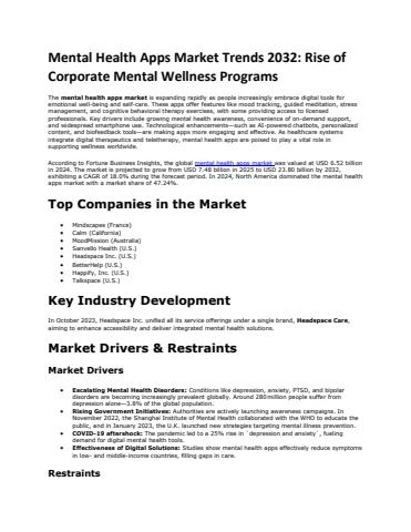 According to Fortune Business Insights, the global mental health apps market was valued at USD 6.52 billion in 2024. The market is projected to grow from USD 7.48 billion in 2025 to USD 23.80 billion by 2032, exhibiting a CAGR of 18.0% during the forecast period. In 2024, North America dominated the mental health apps market with a market share of 47.24%.