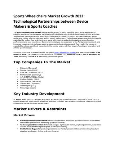 According to Fortune Business Insights, the global sports wheelchairs market size was valued at USD 1.44 billion in 2024. The market is projected to grow from USD 1.57 billion in 2025 to USD 2.96 billion by 2032, exhibiting a CAGR of 9.5% during the forecast period.