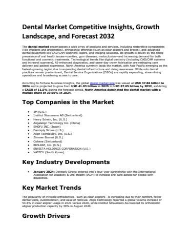 According to Fortune Business Insights, the global dental market size was valued at USD 37.86 billion in 2024 and is projected to grow from USD 41.03 billion in 2025 to USD 87.65 billion by 2032, exhibiting a CAGR of 11.5% during the forecast period. North America dominated the dental market with a market share of 39.06% in 2024.