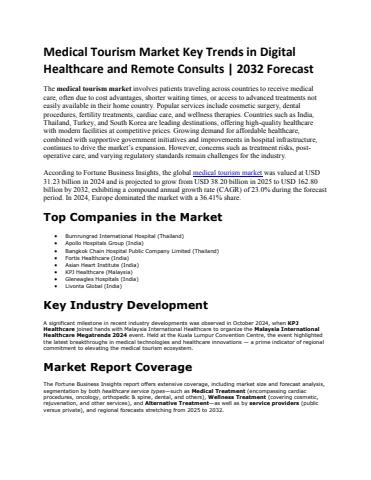 According to Fortune Business Insights, the global medical tourism market was valued at USD 31.23 billion in 2024 and is projected to grow from USD 38.20 billion in 2025 to USD 162.80 billion by 2032, exhibiting a compound annual growth rate (CAGR) of 23.0% during the forecast period. In 2024, Europe dominated the market with a 36.41% share.