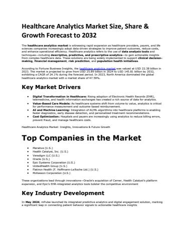 According to Fortune Business Insights, the global healthcare analytics market was valued at USD 22.38 billion in 2023. The market is projected to grow from USD 25.89 billion in 2024 to USD 145.81 billion by 2032, exhibiting a CAGR of 24.1% during the forecast period. In 2023, North America dominated the global healthcare analytics market with a market share of 47.59%.