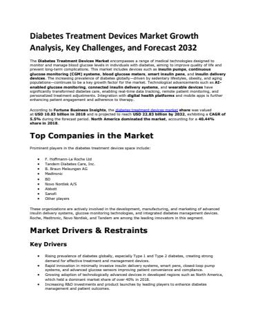 According to Fortune Business Insights, the diabetes treatment devices market share was valued at USD 10.83 billion in 2018 and is projected to reach USD 22.83 billion by 2032, exhibiting a CAGR of 5.5% during the forecast period. North America dominated the market, accounting for a 40.44% share in 2018.