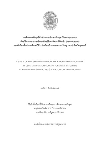 การศึกษาผลสัมฤทธิ์ด้านไวยากรณ์ภาษาอังกฤษ เรื่อง Preposition ด้วยวิธีการสอนภาษาอังกฤษโดยใช้แนวคิดเกมมิฟิเคชั่น (Gamification) ของนักเรียนชั้นประถมศึกษาปีที่ 3 โรงเรียนบ้านหนองหาน (วันครู 2502) จังหวัดอุดรธานี<br><br>A STUDY OF ENGLISH GRAMMAR PROFICIENCY ABOUT PREPOSITION TOPIC<br>BY USING GAMIFICATION CONCEPT FOR GRADE 3 STUDENTS <br>AT BANNONGHAN (WANKRU 2502) SCHOOL, UDON THANI PROVINCE<br><br>นางสาวอาภัสรา สืบพิมพ์สุนนท์ <br><br><br>วิจัยในชั้นเรียนนี้เป็นส่วนหนึ่งของการศึกษาตามหลักสูตรครุศาสตรบัณฑิต สาขาวิชาภาษาอังกฤษ มหาวิทยาลัยราชภัฏอุดรธานี 2566