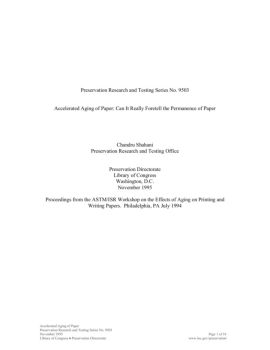 Accelerated Aging of Paper: Can It Really Foretell the Permanence of Paper . Chandru Shahani . Preservation Research and Testing Office . Library of Congress ...