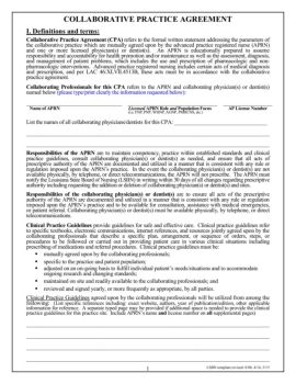 1 LSBN template revised: 8/06, 4/14, 5/15 COLLABORATIVE PRACTICE AGREEMENT . I. Definitions and terms: Collaborative Practice Agreement (CPA) refers to the formal ...