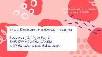 1.3.a.6. Demonstrasi Kontekstual - Modul 1.3 Pendekatan Inkuiri Apresiatif (IA) merupakan strategi perubahan kolaboratif yang berbasis kekuatan. IA merupakan solusi strategi perubahan yang tidak dimiliki oleh pendekatan lainnya. IA mengaktualisasi potensi masing masing individu dalam kelompok menjadi kekuatan yang luar biasa dalam melakukan perubahan. BAGJA merupakan langkah – langkah yang mengikuti pendekatan Inkuiri Apresiatif.