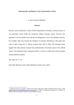 1 Trade Intensity and Business Cycle Synchronicity in Africa S. Jules-Armand TAPSOBA 1 Abstract Business cycle synchronicity, which is the key requirement for sharing ...