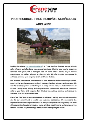 At Crane Saw Tree Services, we specialize in safe, efficient, and affordable tree removal solutions. Whether you need a large tree removed from your yard, a damaged tree cut down after a storm, or just routine maintenance, our skilled arborists are here to help. We offer top-tier tree removal in Adelaide, ensuring your property is safe and looks its best.