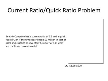 Current Ratio/Quick Ratio Problem Beatnik Company has a current ratio of 2.5 and a quick ratio of 2.0. If the firm experienced $2 million in cost of