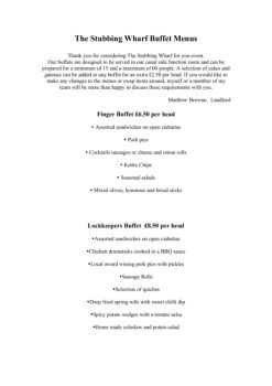 The Stubbing Wharf Buffet Menus Thank you for considering The Stubbing Wharf for you event. Our buffets are designed to be served in our canal side function room and ...