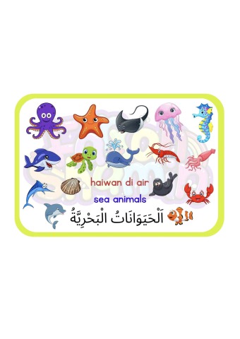 Mengenali dan mengetahui haiwan-haiwan yang hidup di dalam air dalam bahasa arab, bahasa melayu dan bahasa inggeris.