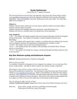 Exotic Earthworms Lesson Plan for 7th grade Life Science This lesson plan borrows heavily from web materials at the Great Lakes Worm Watch website,