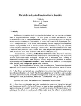 1 The intellectual roots of functionalism in linguistics T. Givón University of Oregon and White Cloud Ranch Ignacio, Colorado 1. Antiquity In Biology, the mother of ...