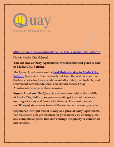 If you believe there are better Hotels to stay in Manchester. You are right! Quay Hotels Salford Quays is second to none Serviced Apartment Hotel which offers all the modern amenities, well-furnished interiors, courteous staff, 24*7 security, parking facilities, in-house kitchenette, mini coffee and snack bar and more. So, if you are on your business trip, you can make your reservation with us and get assured of the quality services. We have a beautiful property to offer you and your presence makes it a beautiful place.
