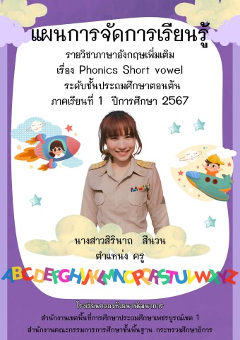 แผนการจัดการเรียนรู้ เรื่อง Phonics Short Vowels เล่มนี้ จัดทําขึ้นสําหรับใช้เป็นแนวทางในการจัดการเรียนรู้กลุ่มสาระการเรียนรู้ภาษาต่างประเทศ (ภาษาอังกฤษ) ในรายวิชาเพิ่มเติม ชั้นประถมศึกษาตอนต้น ภาคเรียนที่ 1 ปีการศึกษา 2567 ประกอบด้วยหน่วยการเรียนรู้จํานวน 1 หน่วย 5 แผนการจัดการเรียนรู้ รวม 10 ชั่วโมง